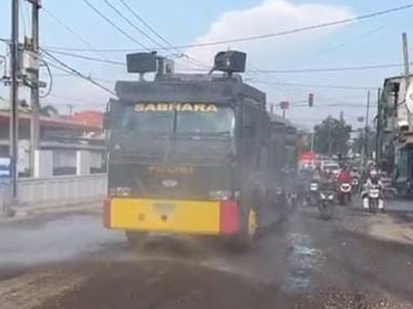 Kali ini Polisi menerjunkan mobil tersebut bukan untuk menghalau massa aksi demo, melainkan mengusir debu jalanan imbas proyek pelebaran jalan raya tersebut.